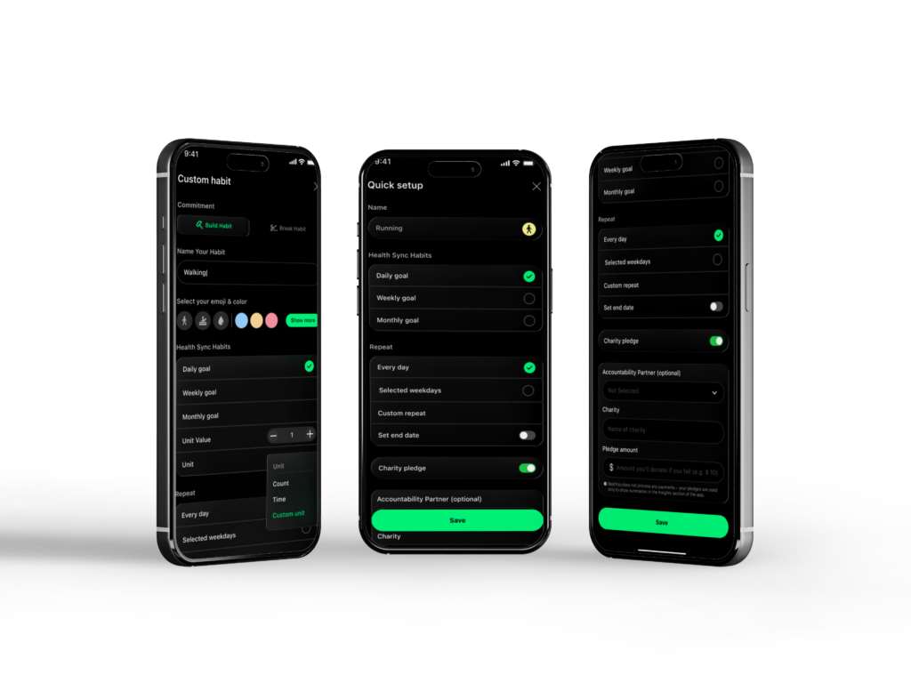 Set daily, weekly, or monthly goals. Choose how you measure progress by count, time, or a custom unit. Decide how often the habit repeats and add an end date if needed.BeatYou adapts to your routine, not the other way around.